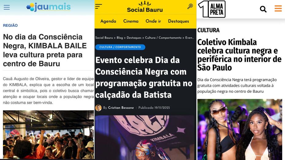 Atuação como coordenadora da assessoria de imprensa do Kimbala Baile, evento realizado em Bauru em celebração ao Dia da Consciência Negra. Exerci a liderança e supervisão da equipe de assessoria, sendo responsável pela criação e gestão do mailing, orientação editorial dos redatores de releases e relacionamento direto com jornalistas. A estratégia de comunicação resultou em ampla cobertura regional e nacional, com destaque em veículos como Alma Preta e Globoplay.