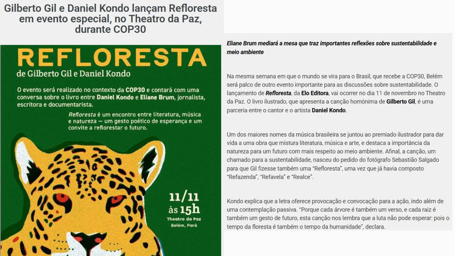 Participação na divulgação do lançamento de “Refloresta”, livro de Daniel Kondo e Gilberto Gil, inspirado na canção homônima. Fui responsável pela redação dos releases, com um olhar editorial estratégico que destacasse a chegada do livro ao mercado durante a semana da COP 30, evidenciando sua relevância no contexto do evento.